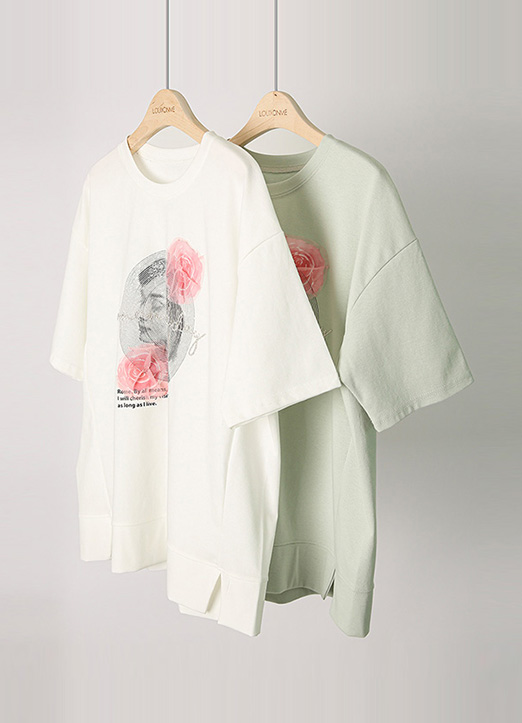 [Louis Angel] 玫瑰蕾丝印花下摆侧开叉T恤