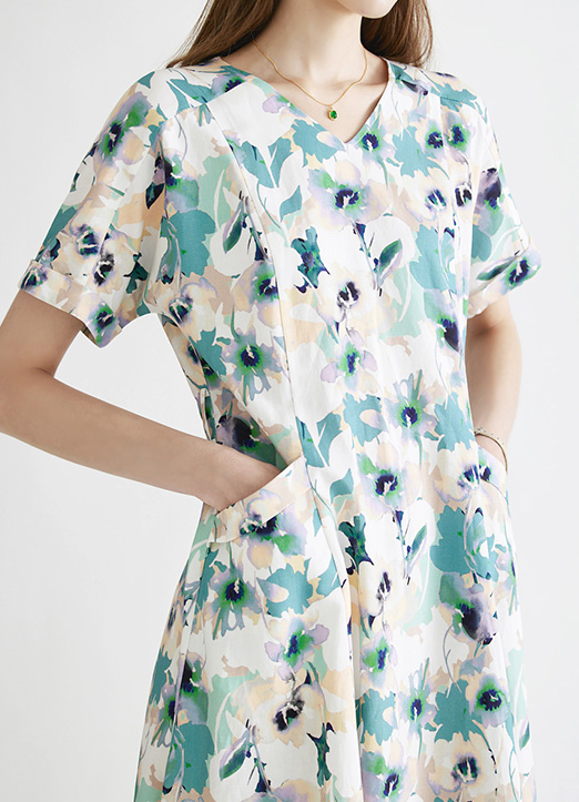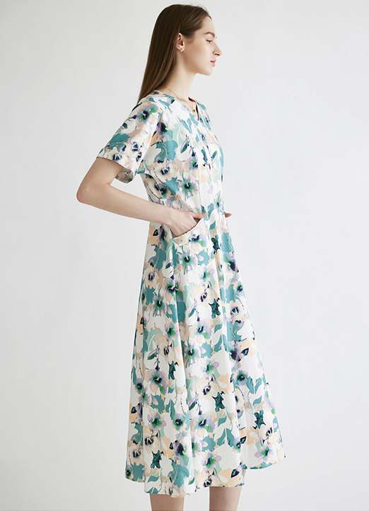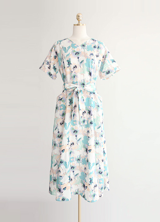 [Theonme] 水彩花纹侧面口袋A线条连衣裙