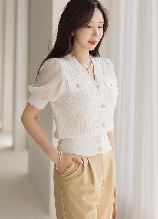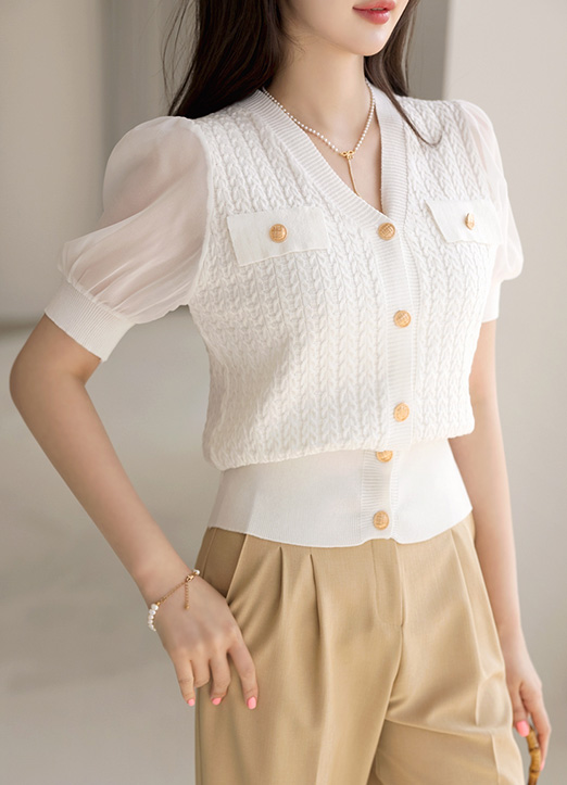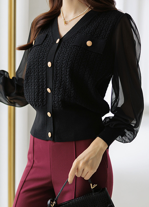 ["麻花纹编织上金色纽扣和~雪纺袖子配色,展现优雅高级情调的针织雪纺衫~ 下摆是松紧带设计,可以展现出多样的版型,有女人味的线条~ "]