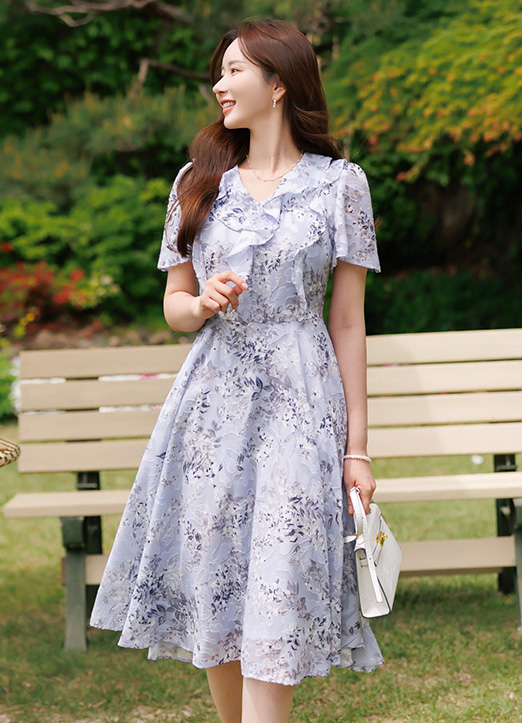 [Louis Angel] 水墨画透视荷叶边喇叭袖连衣裙