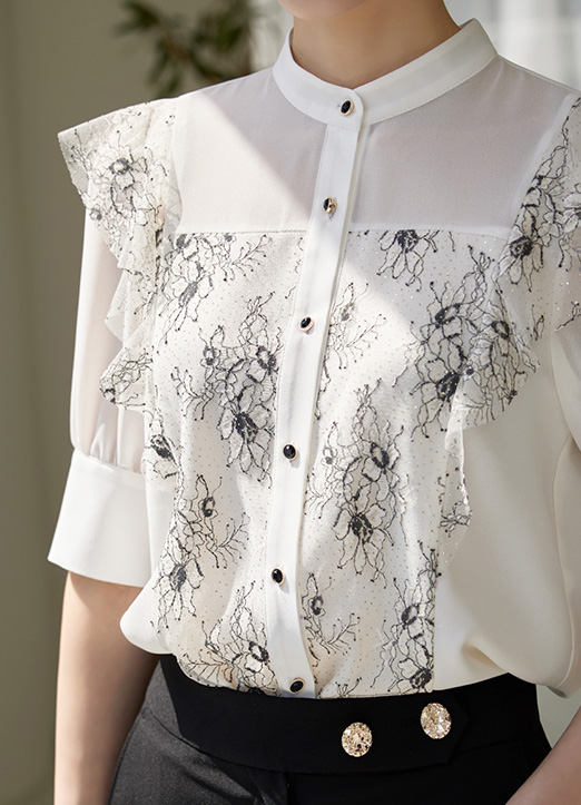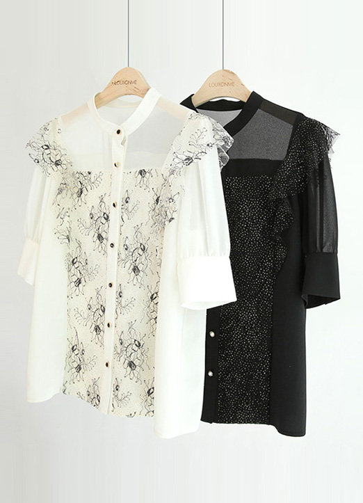 [添加了珍珠的花蕾丝,华丽又高档的雪纺衫,干净利落地立领,能感受到稚嫩且女人味十足的氛围。夏季适合穿着的凉爽的雪纺衫。]