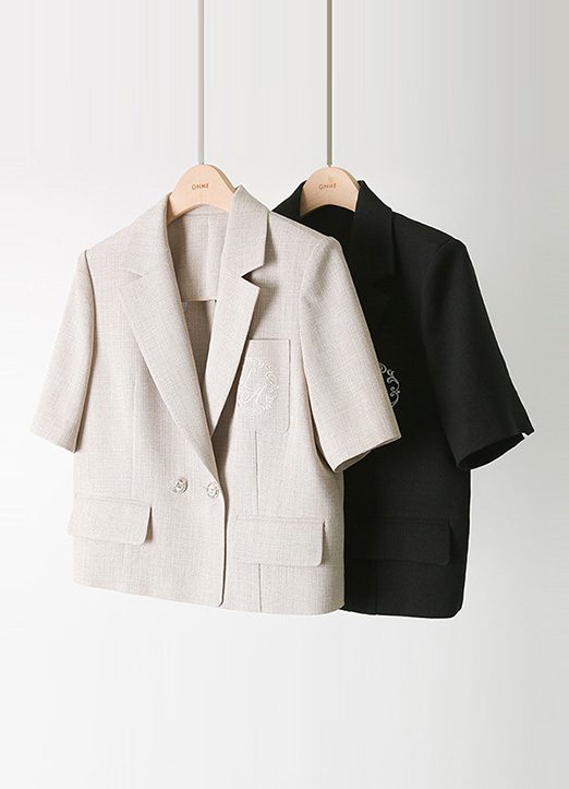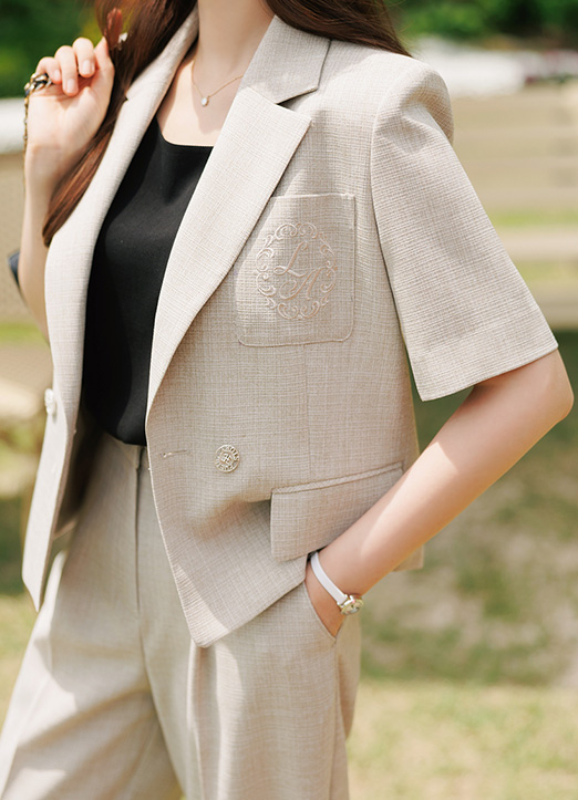 [用时尚的刺绣给予高档的点缀,能感受到亚麻的组织感,充满凉爽感的轻盈的夏季材质,半露脐衣长度,双排扣增添了华丽且女性化的亮点。]