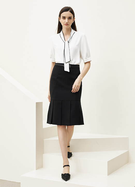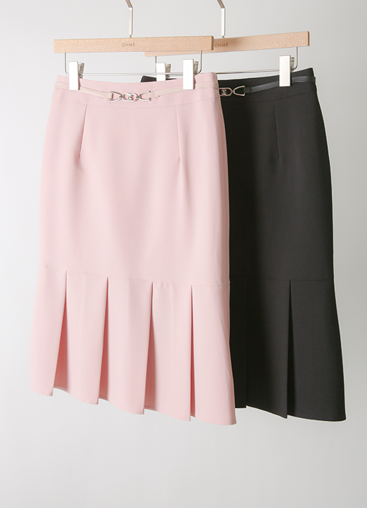 [底端百褶设计为亮点的中长裙。前面部分的带扣腰带设计,成为隐隐的亮点,稍微有点弹力,给人舒适的穿着感,适合现代时尚又干练地风格。]