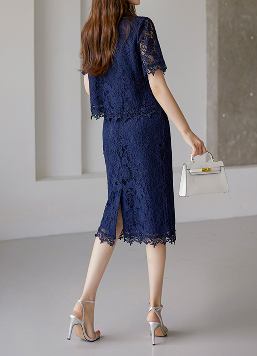 [花朵图案的蕾丝,能感觉到女人味和华丽修身H线条优雅的蕾丝裙:) 只在底端以透视收尾, 纤细的H型线条把腿部线条演绎得更加长,后开叉细节提高了活动性。]