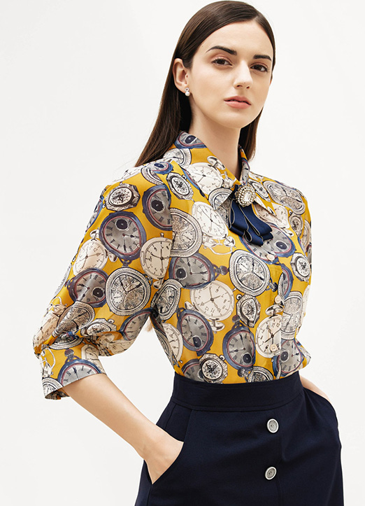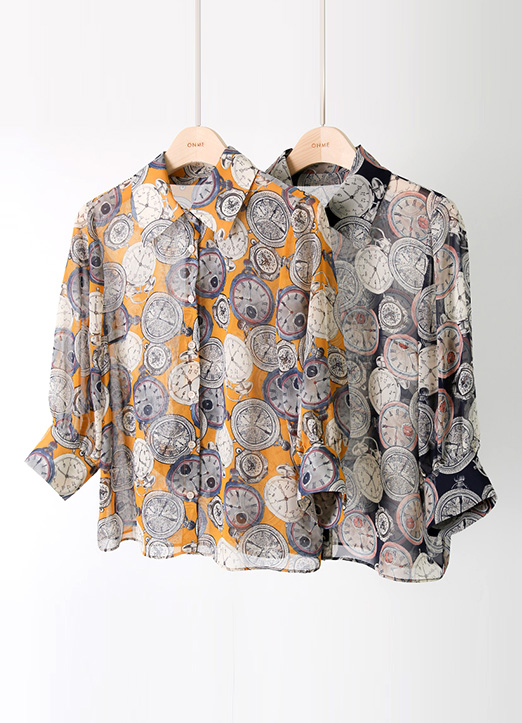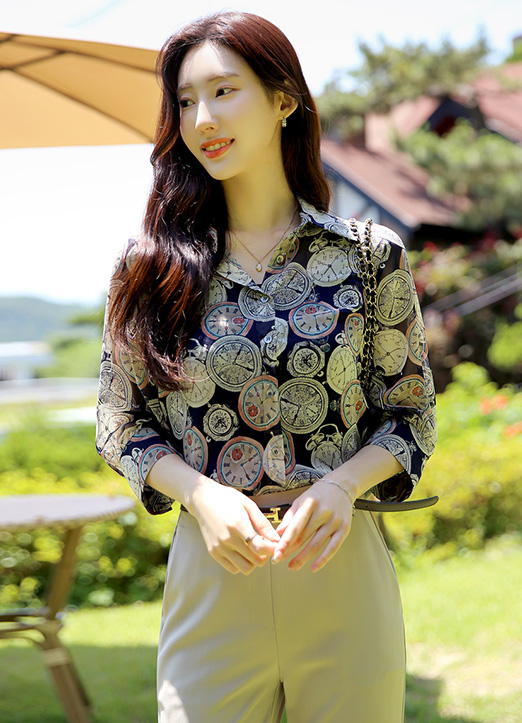 [Louis Angel] 时钟图案7分泡泡袖雪纺衬衫
