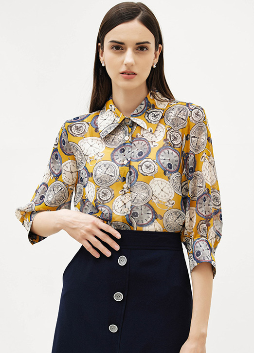 [用手表图案做了独一无二的配色,加上泡泡袖轮廓的7分袖,优雅地展现出丰满的线条,很有魅力。适合夏季到换季期一直穿着。]