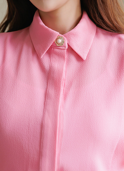 [用大的珍珠珠宝扣做了亮丽的点缀, 飞边袖增添可爱感的雪纺衫:) 像泡泡纱一样薄且能感觉到凉爽的材质, 夏季穿着舒适, 有魅力的单品。]