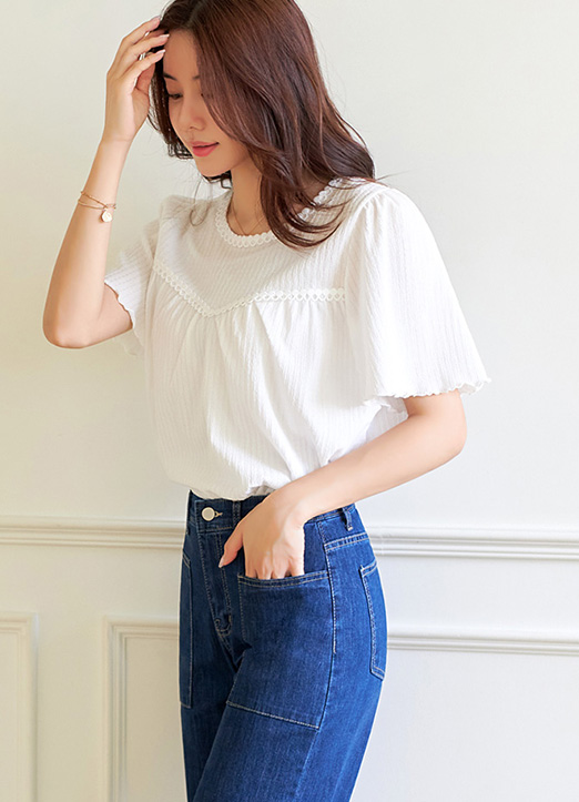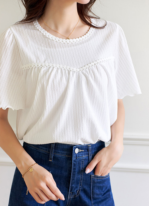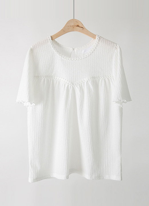 泡泡纱蕾丝线条泡泡袖雪纺衫