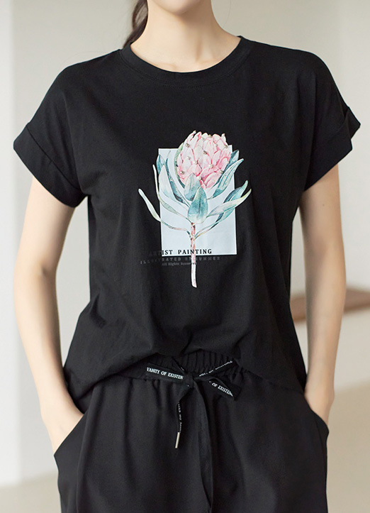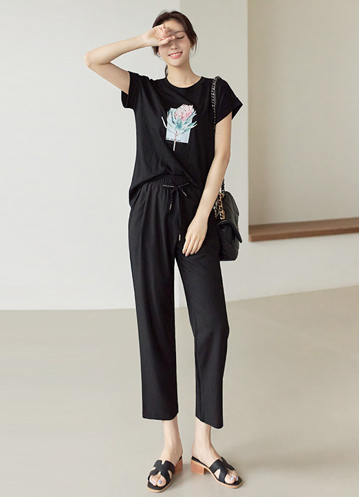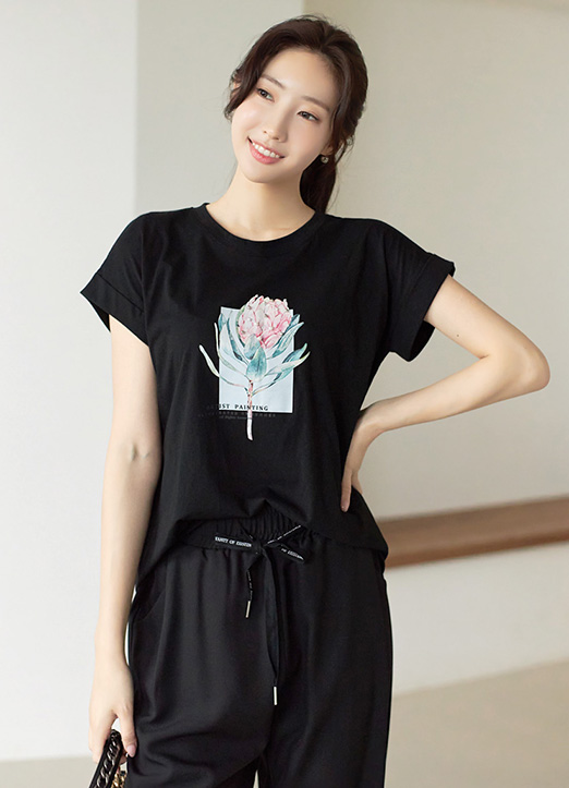 [荷花印花上镶钻&珍珠点缀的卷边蝙蝠T恤:) 没有袖圈的半蝙蝠版,自然遮盖体型,演绎柔弱风格。]