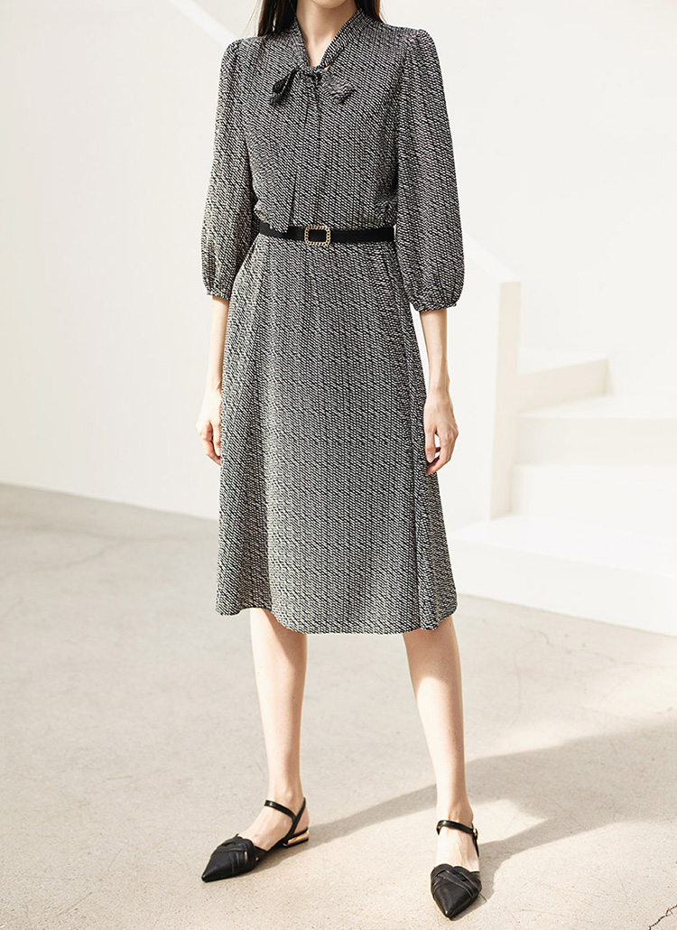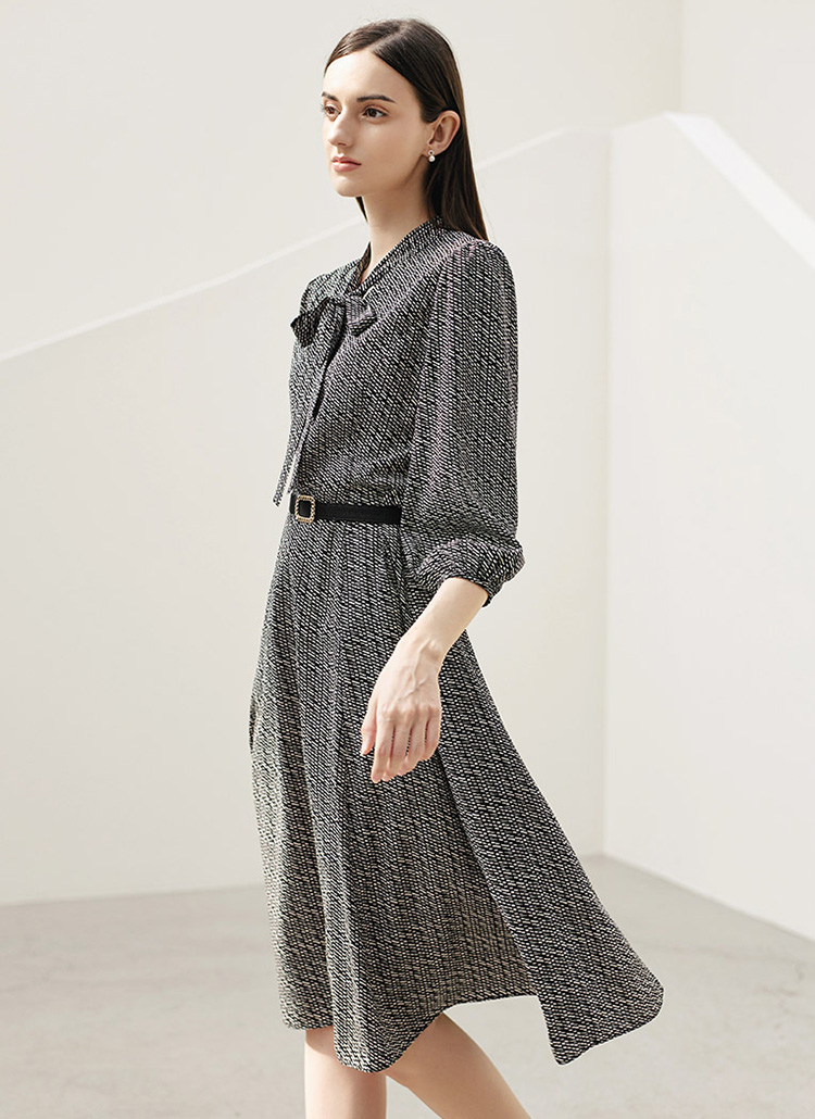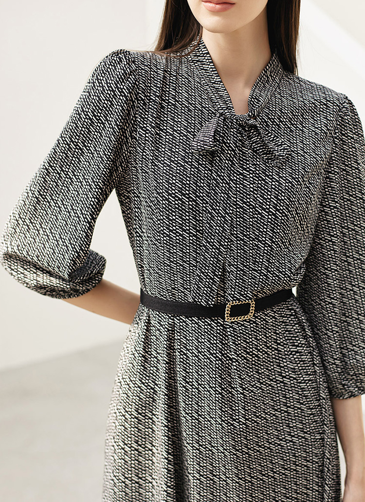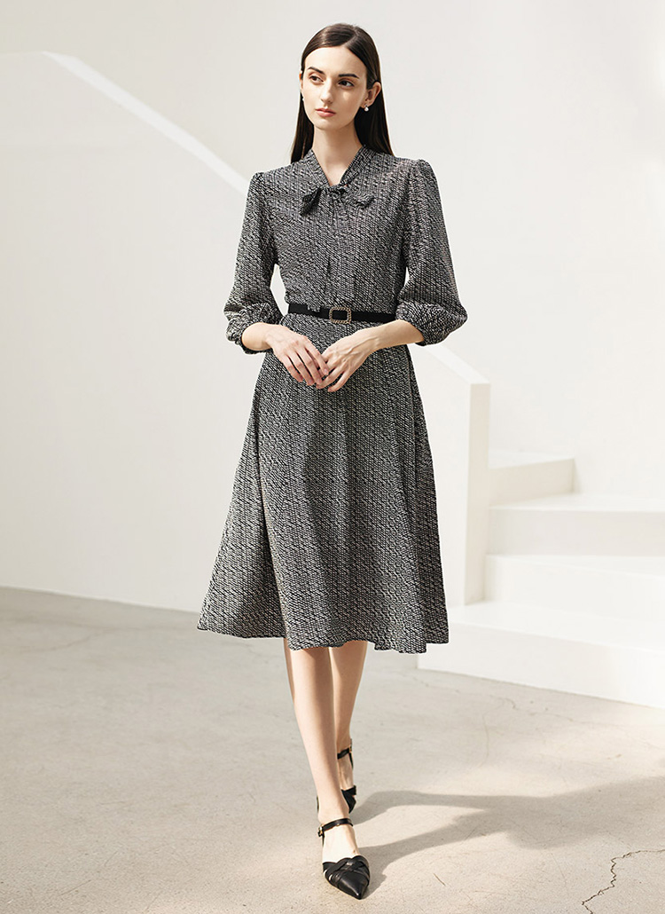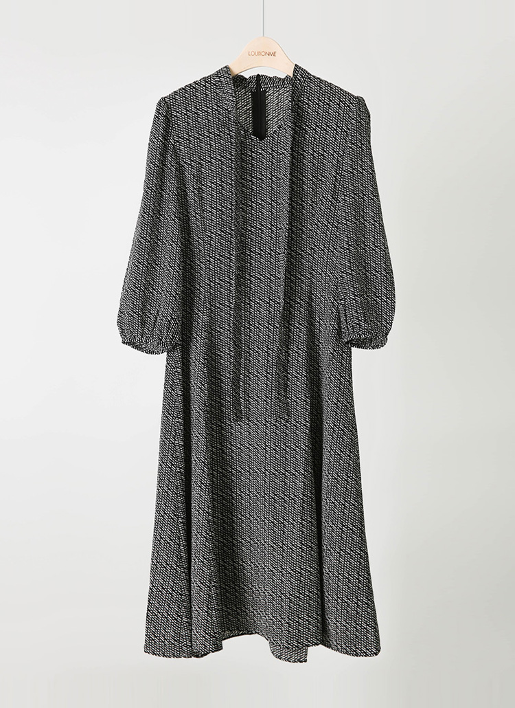 [平静的几何图案,干练美Up! 纤细的腰线和~丰盛的喇叭设计,展现帅气女人味的喇叭连衣裙。 用蝴蝶结领带,可以展现多种风格的连衣裙。]
