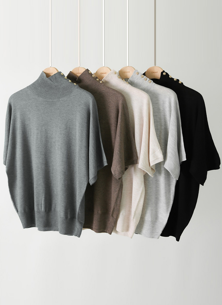 [山羊绒和纤维混纺,展现极强柔软感,添加了金色纽扣的高档的针织衫:) 稍微宽松的版型,可以调节领口线条版型,展现出不闷的感觉。]