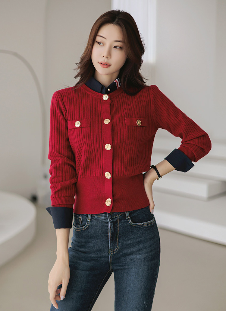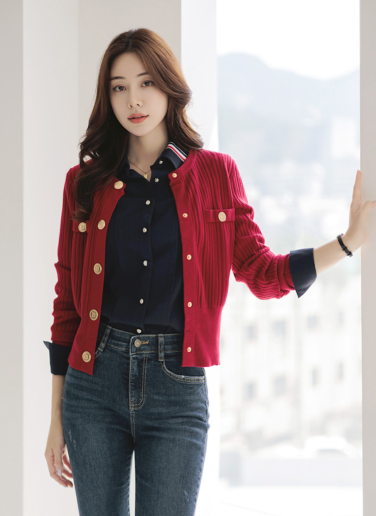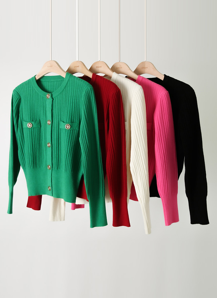 [柔软且厚实的竖纹针织衫,结实的金色纽扣为亮点,展现干练帅气情调的开衫~ 稍微宽松的胸围,下摆是罗纹布的设计,演绎出干练的风格!]