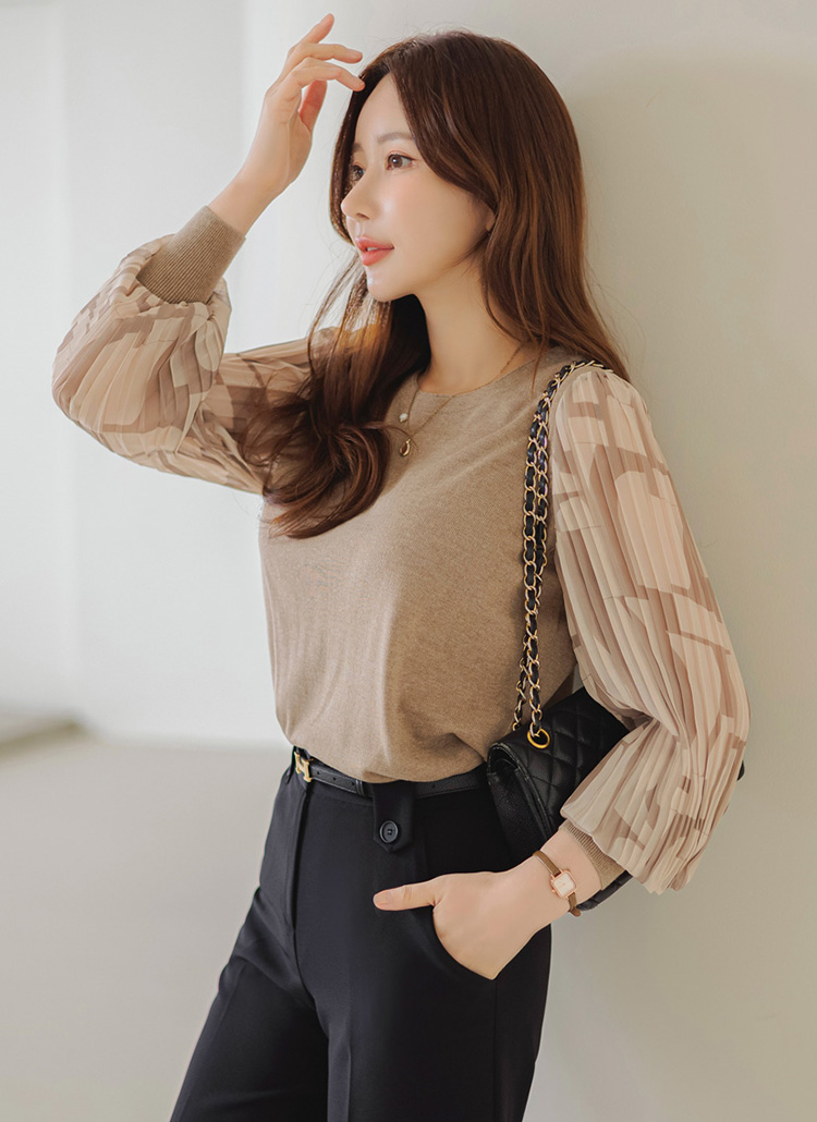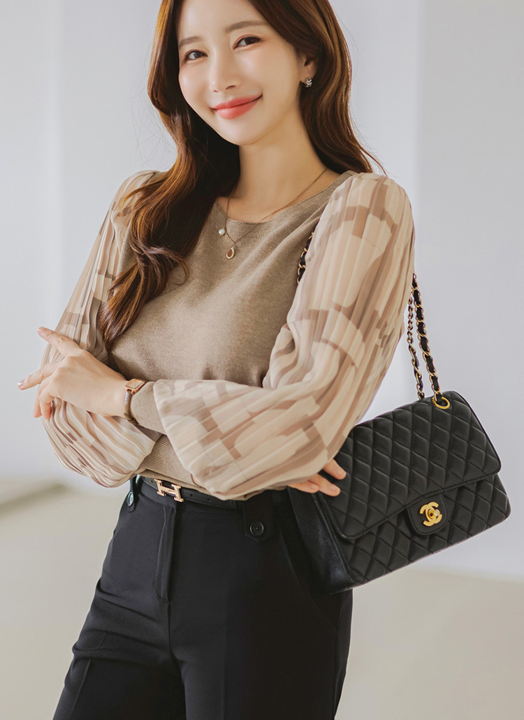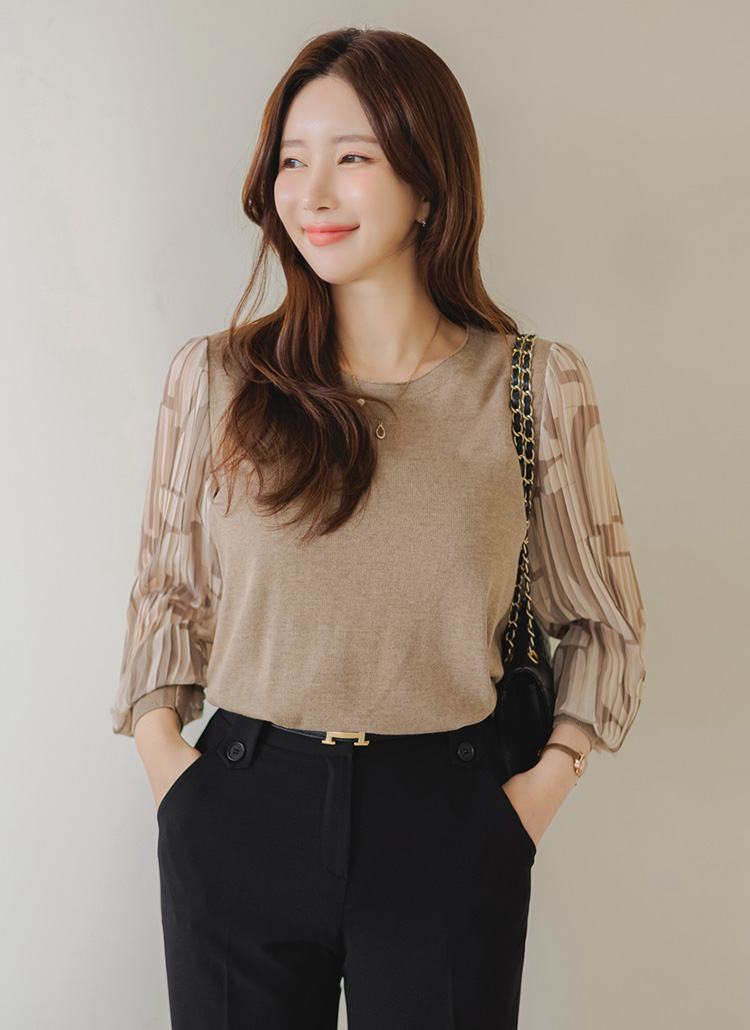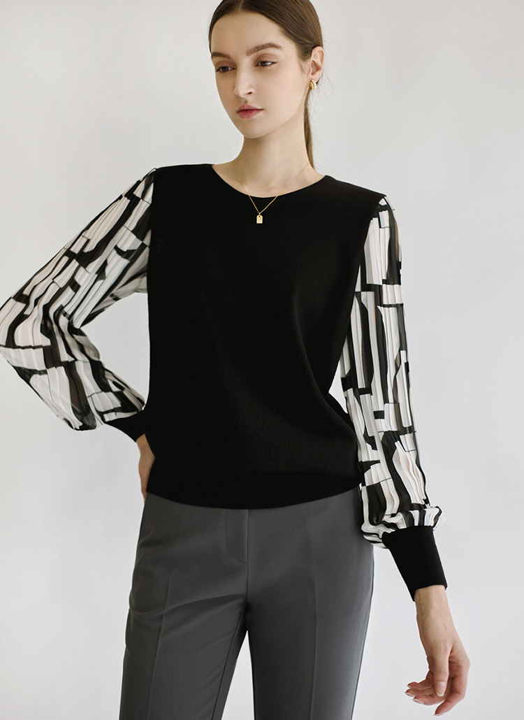 패턴이 더해진 플리츠 쉬폰 소매로 우아함을 더한 블라우스 니트에요 :)