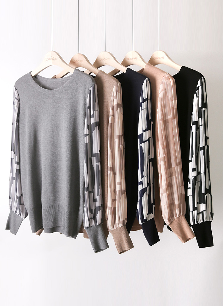 [添加了图案的百褶雪纺袖子,增添了优雅感的雪纺衫针织衫:) 稍微宽松一点的标准版,圆领基本款,哪里都适合搭配。]