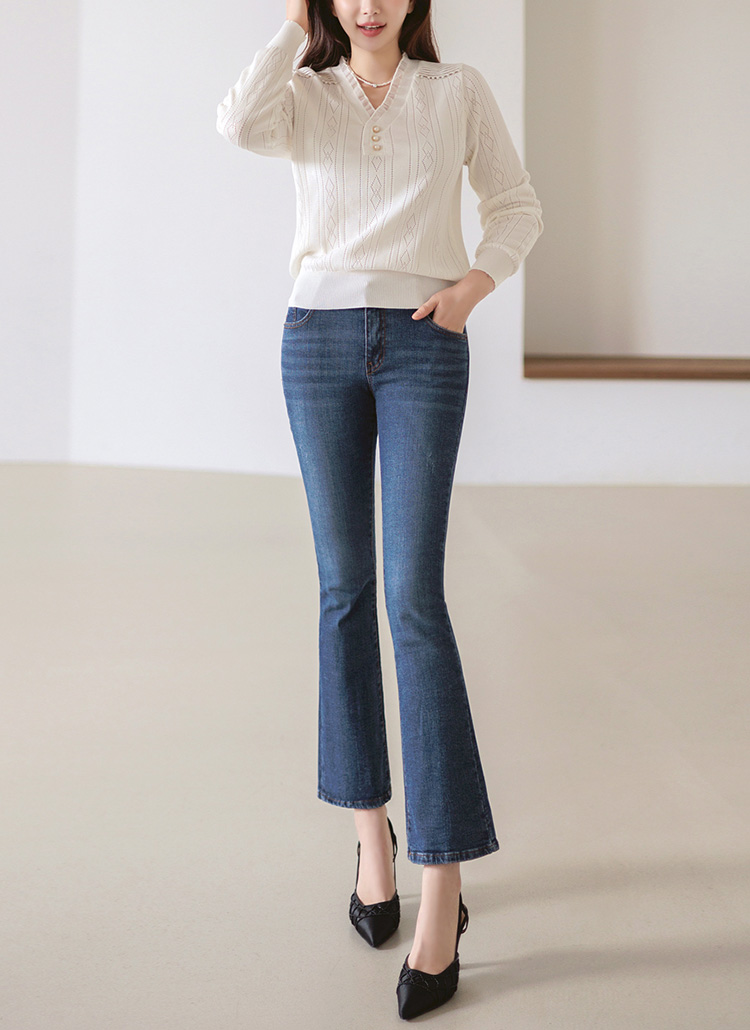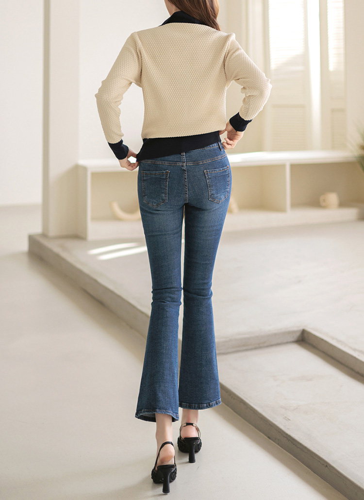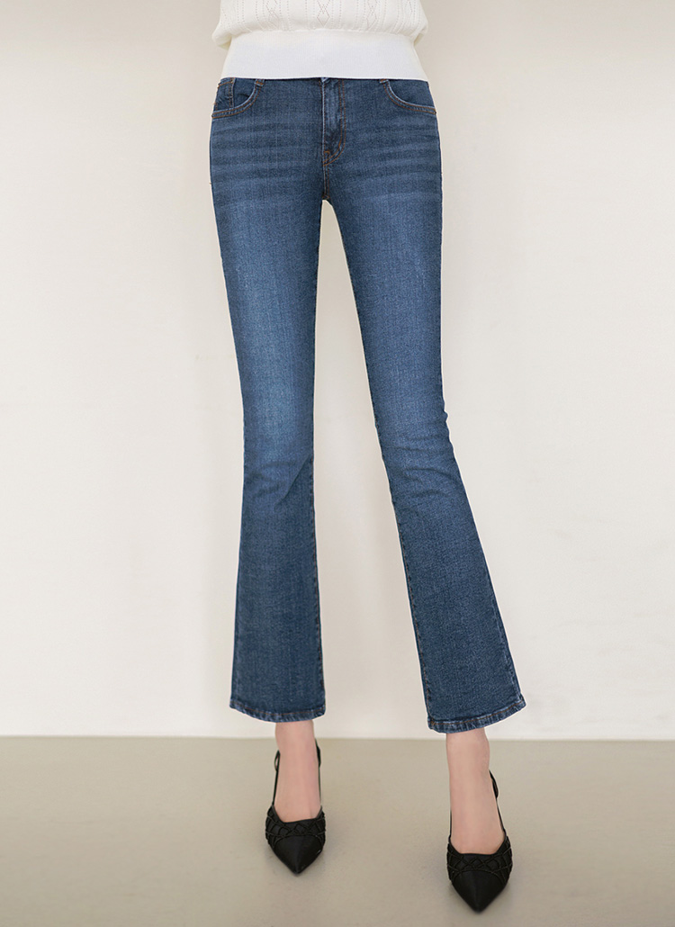[展现简约干净利落的曲线的修身款喇叭牛仔裤:) 垂到脚踝曲线的长度,腿部线条显得修长,腰部线条的隐藏松紧带设计,穿着舒适!]
