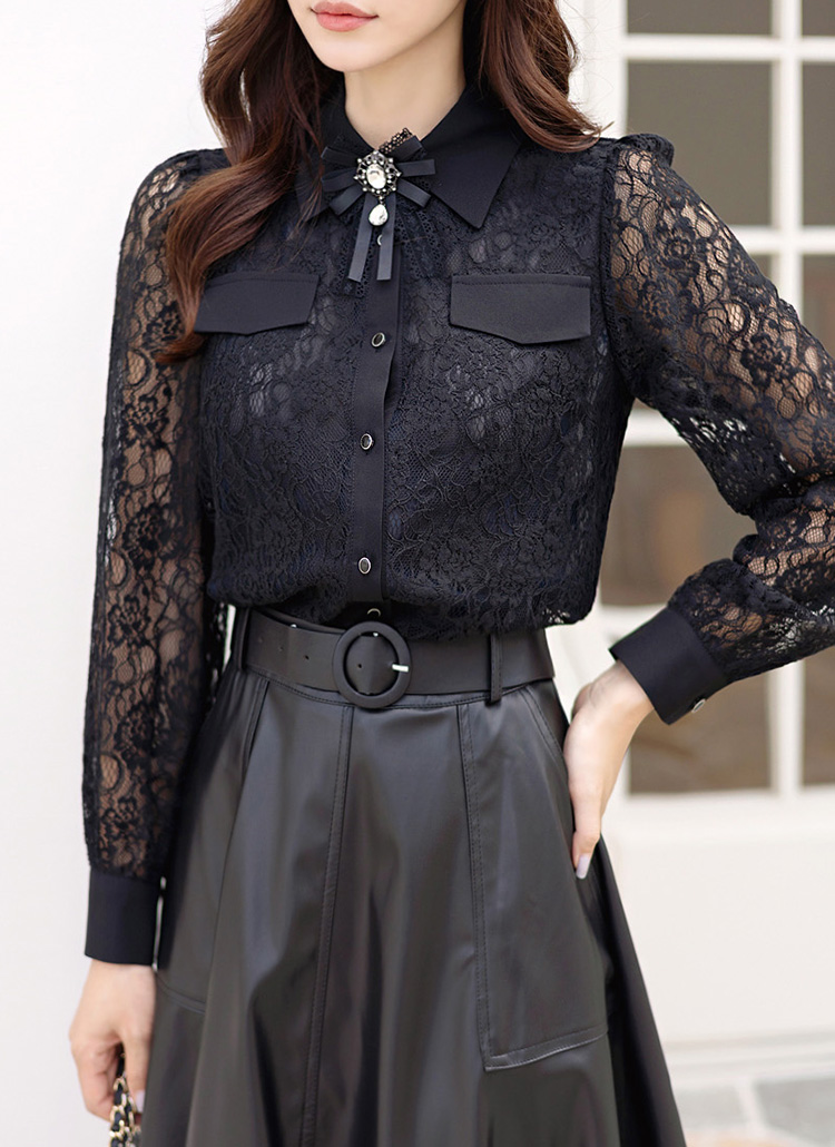 [民族风表现的花纹图案蕾丝,展现魅惑女性情调的蕾丝领子雪纺衫~ 轻便的重量感,有光滑触感的内衬,能打造出毫无单调感的风格~]