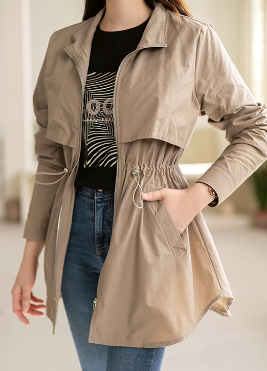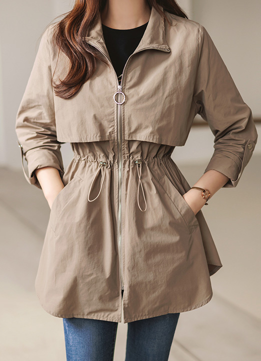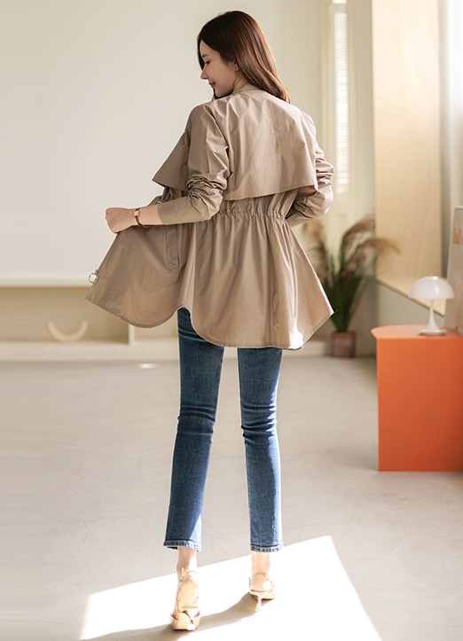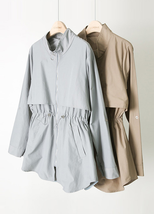 [腰部系带可以演绎出纤细的线条, 卷边细节,适合换季期多样使用的户外夹克:) 适当的厚度,穿着没有负担,底端自然地以A字型展开,展现纤细的身体曲线。]