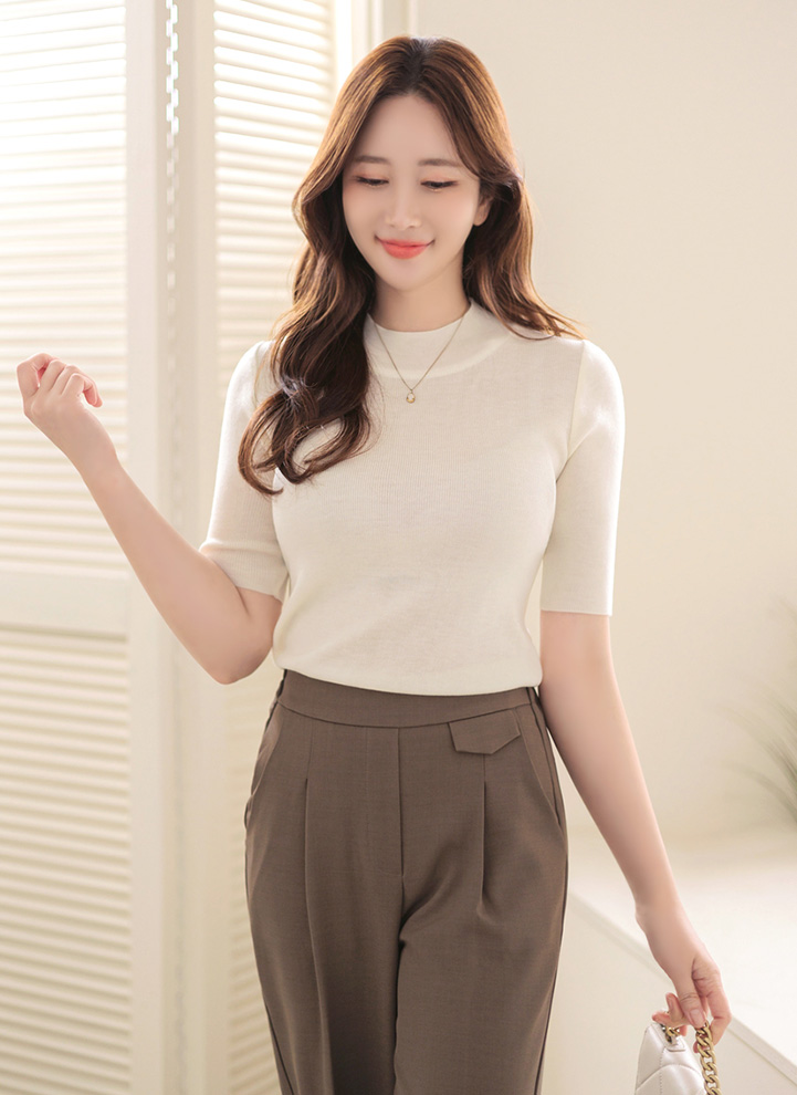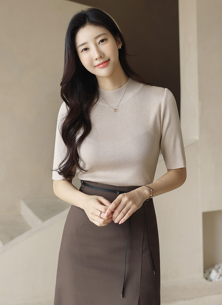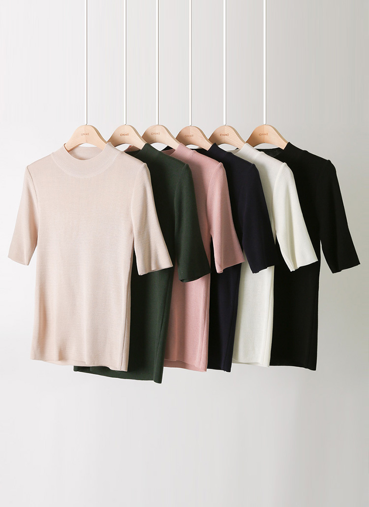 [简约干净利落的修身基本款,因为是半高领,领口显得更加修长,5分袖长,可轻松遮盖手臂赘肉,演绎出纤细的线条。]