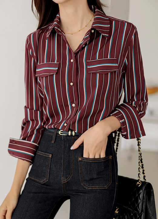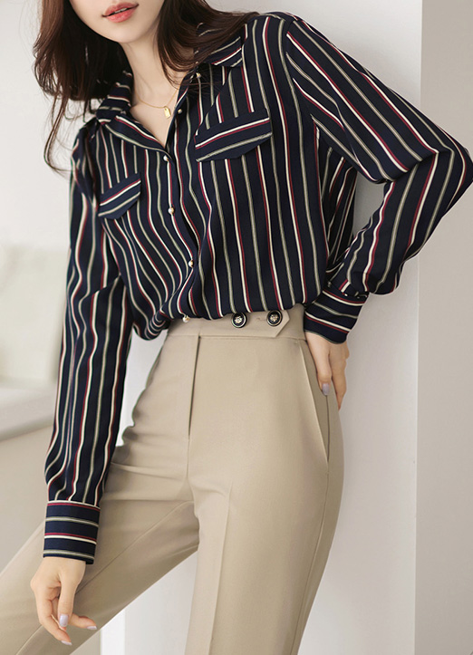 [混合颜色演绎的条纹图案,给人以另类又干练的情调的雪纺衫~ 搭配假口袋盖,轮廓更立体地表现出来,接触皮肤的触感非常光滑~]