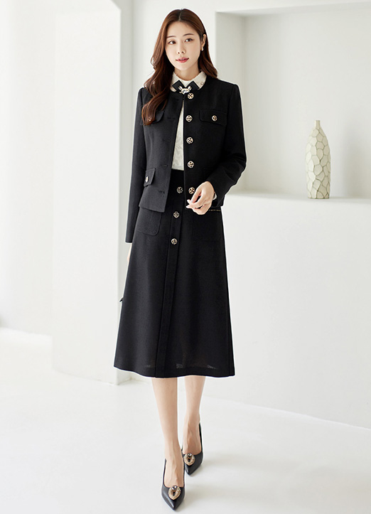 [向下隐隐约约散开的轮廓上,金色纽扣和粗花呢胶带细节搭配,展现奢华优雅女性曲线的半L型裙子~ 没有体型负担,展现光滑的轮廓,穿着感很好~]