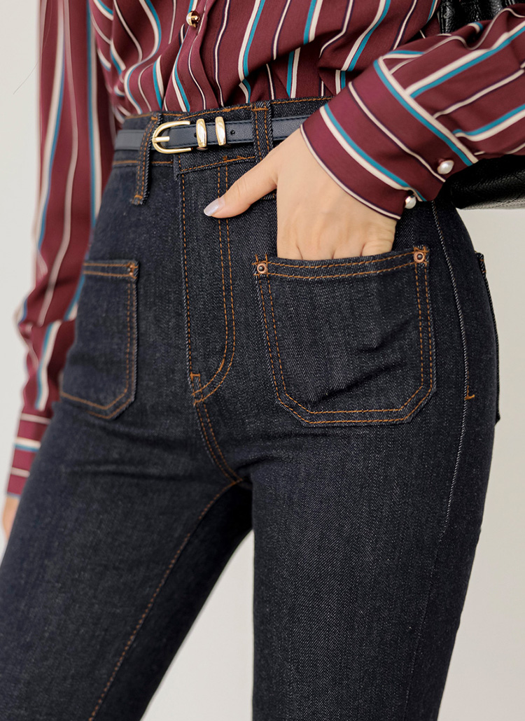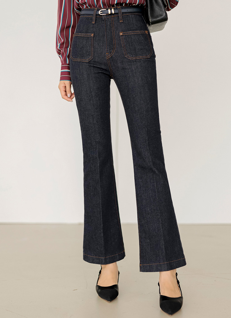 [用缝线突显流行亮点,用罗织机细节的喇叭牛仔裤:) 前口袋能感觉到休闲感,腿部线条营造出女性化且奢华的线条。]