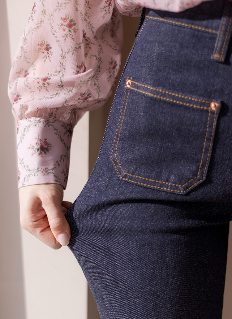 진한 생지 컬러로 레그라인이 슬림해 보이는 효과를 주며