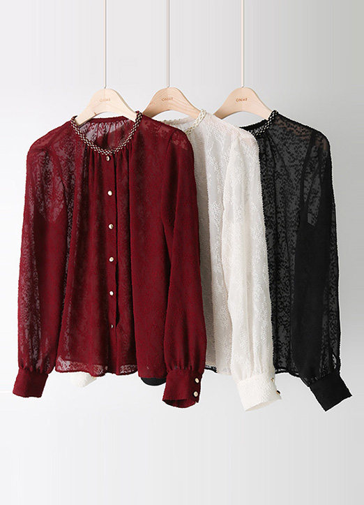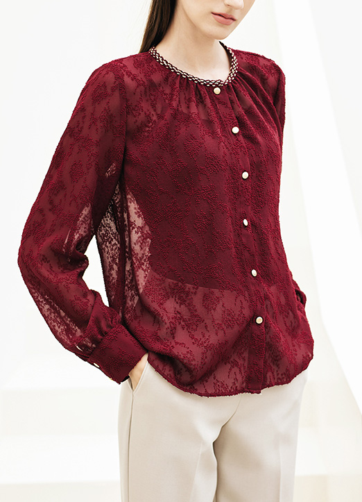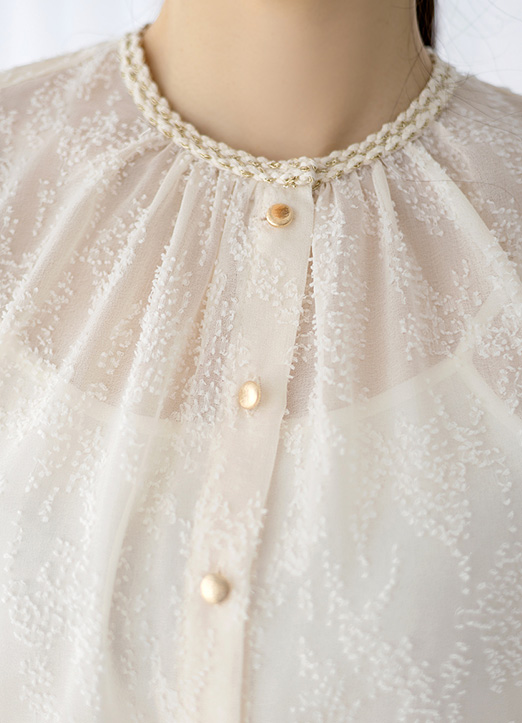 [圆点图案的提花像草叶藤蔓一样展现出来,稚嫩~ 展现民族风帅气的提花雪纺衫~ 整体上透视的面料上,完全没有单调感!]