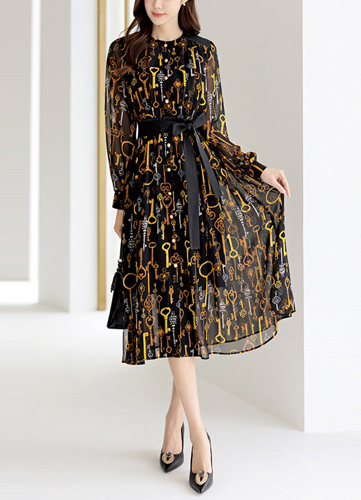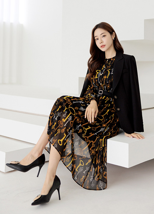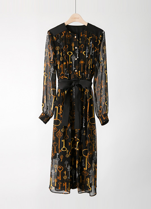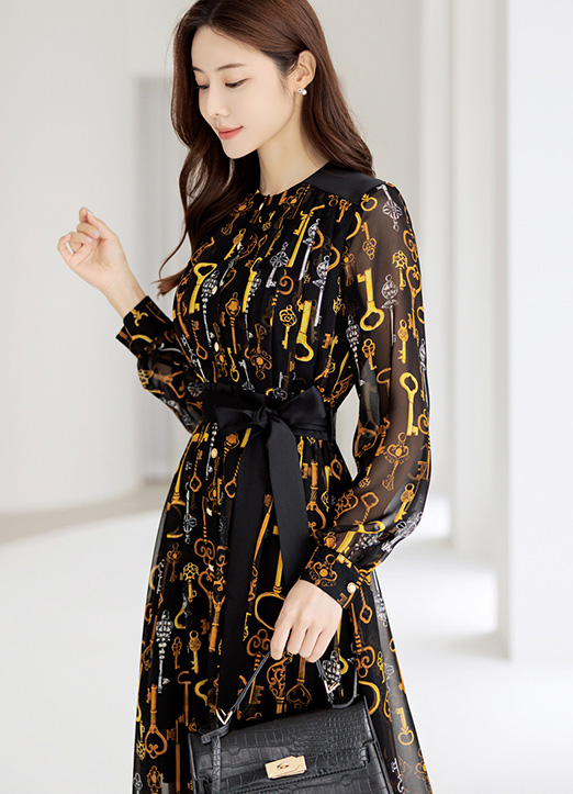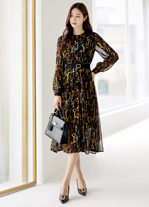 [用金色的链条图案给予了高档的点缀,雪纺材质,能感受到优雅感的连衣裙:) 从肩部线条开始赋予细褶细节,腰带由套装构成,添加了可爱的情调更加有魅力 ~]