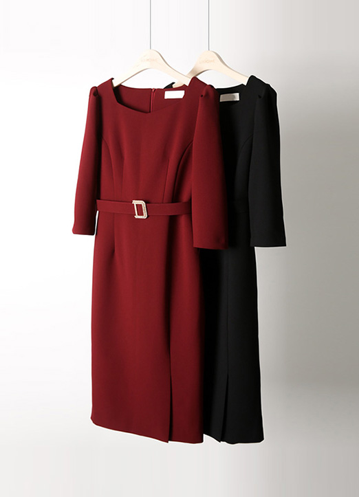 [用方形领口演绎出女人味的轮廓,镶钻突显高档大气亮点的腰带为套装构成的连衣裙:) 纤细的版型和开叉线条使腰部更加纤细,底端侧开叉腿部线条显长效果。]
