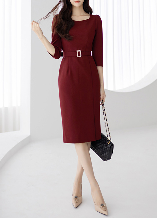珠宝腰带套装方形领修身连衣裙