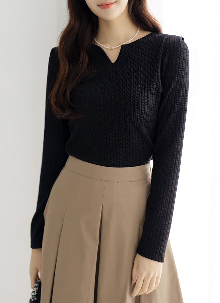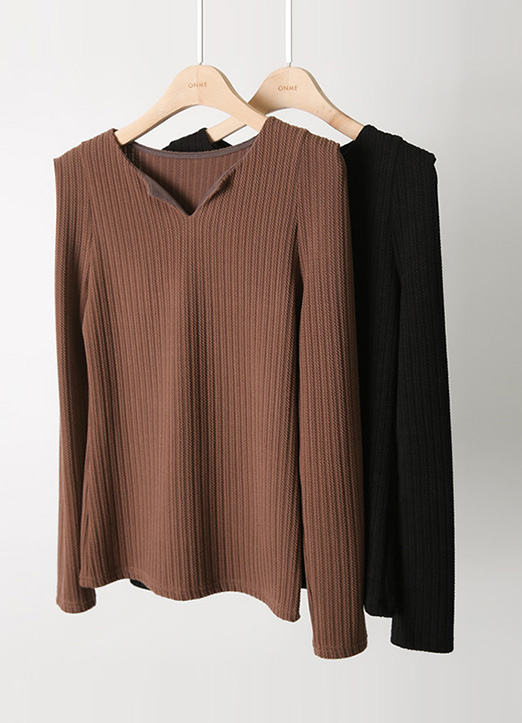 브이넥으로 트여 페미닌한 실루엣을 연출해주며
