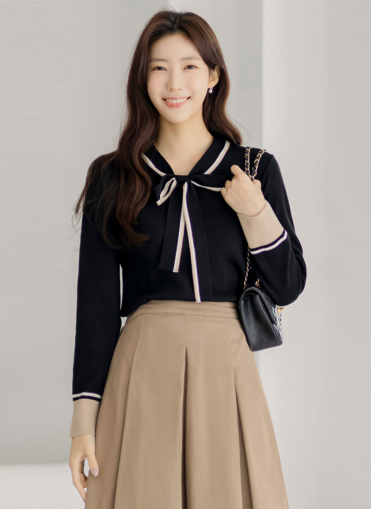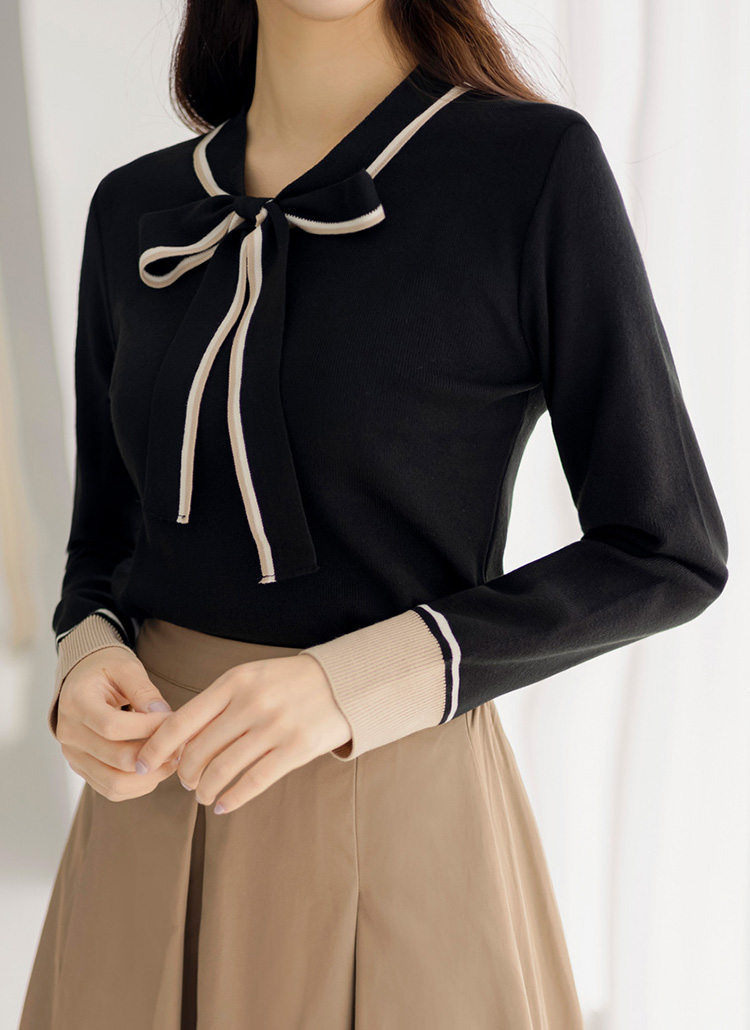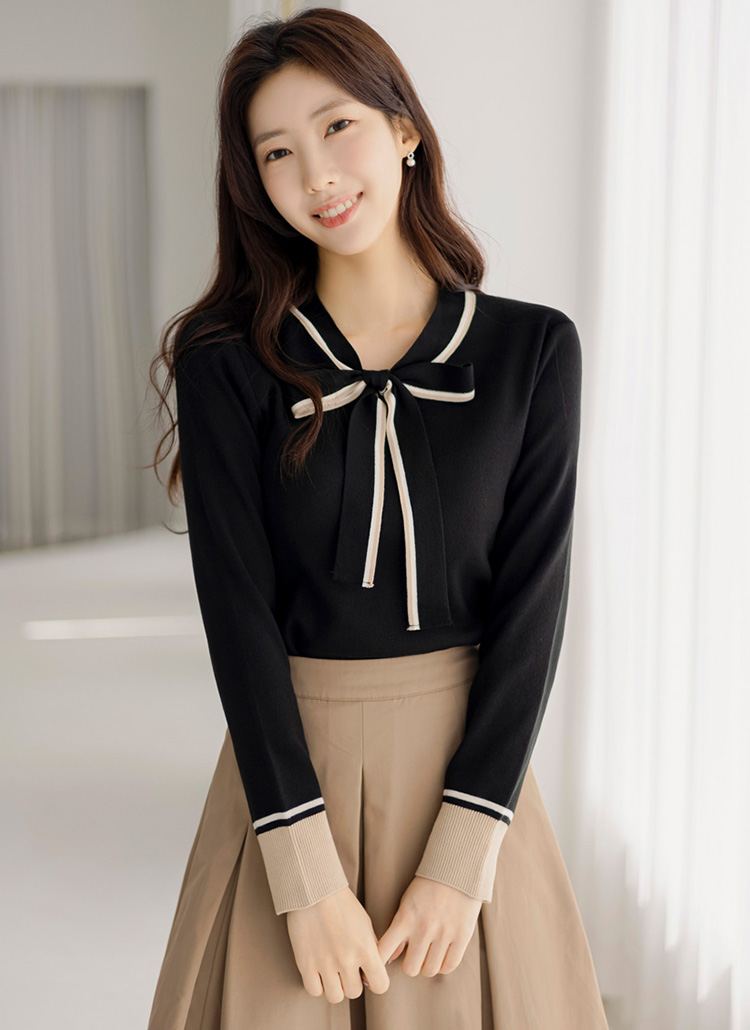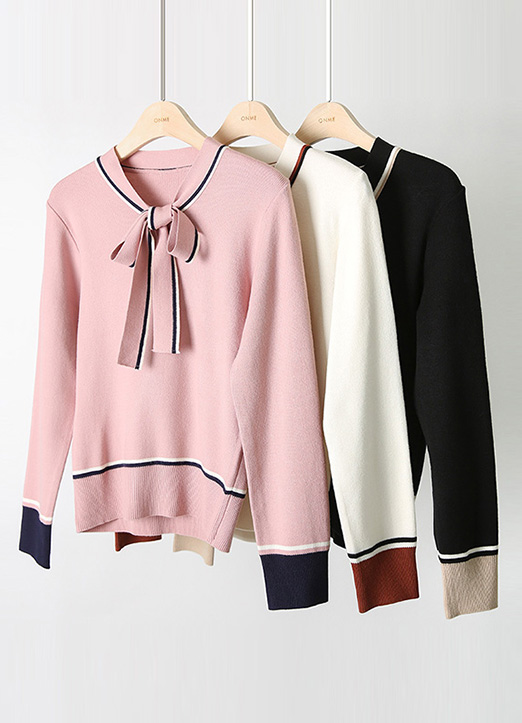 리본넥으로 러블리함을 가득 연출해주는 배색 니트에요 :)