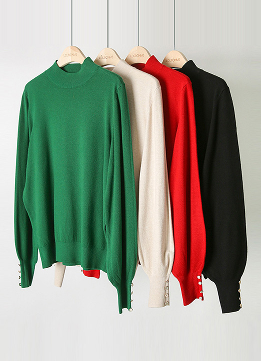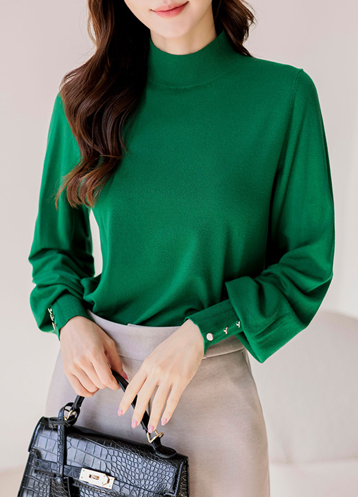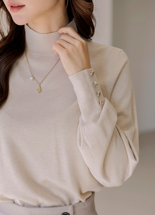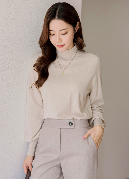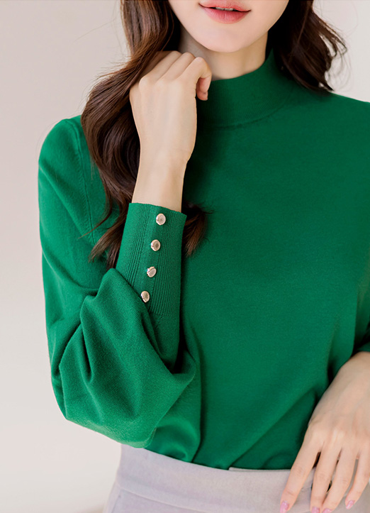 [ 柔和包裹肌肤,添加了金饰的泡泡袖,展现优雅感的中高领针织衫:) 稍微游刃有余的标准版,自然地遮盖赘肉的同时穿着舒适。]