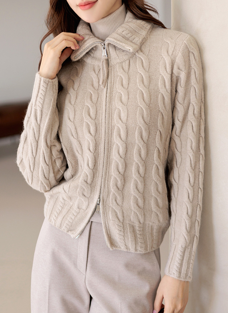 麻花纹高领双向拉链针织开襟毛衫