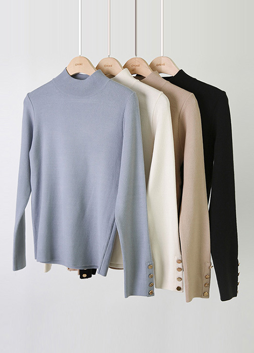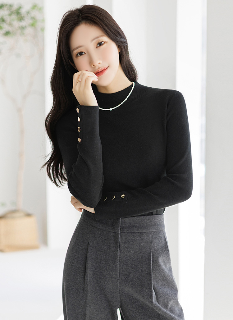 [袖子上用金色纽扣增添了高档感,半高领口展现温暖情调的针织衫:) 简约的版型和设计上金色纽扣增添了简约的亮点,演绎出长领口线条。]