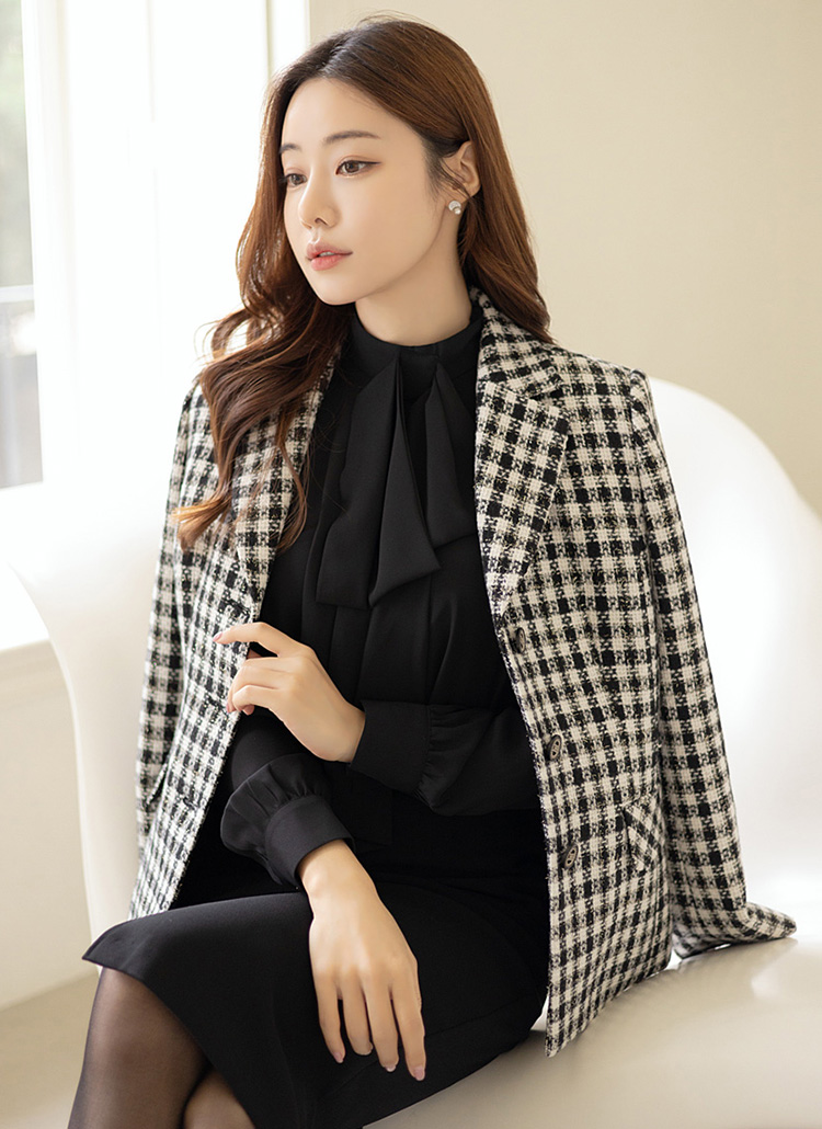 [隐隐散开的半腰腰部曲线,既没有负担~展现完美线条感的子修身夹克,用粗花呢等厚原丝,同时演绎出干练美十足的现代风格。]