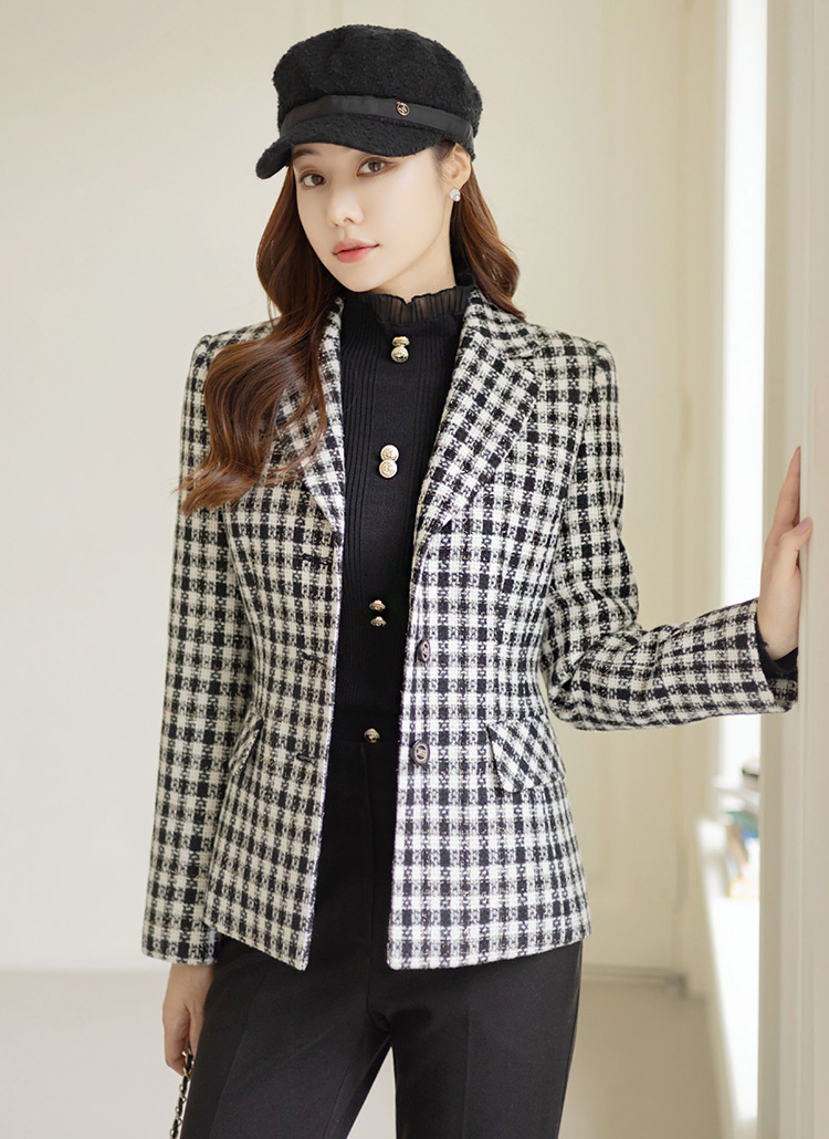 [隐隐散开的半腰腰部曲线,既没有负担~展现完美线条感的子修身夹克,用粗花呢等厚原丝,同时演绎出干练美十足的现代风格。]