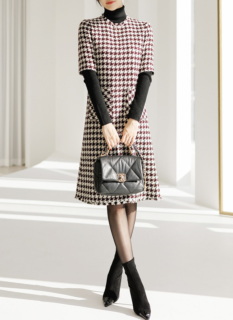 [LouisAngel] 酒红色燕子格纹花边装饰短袖连衣裙