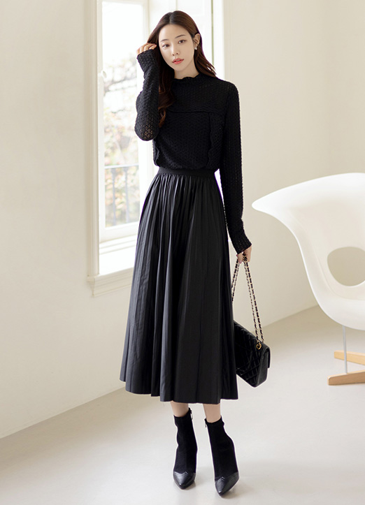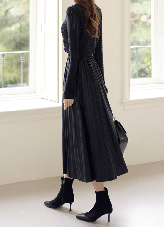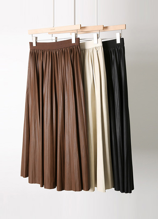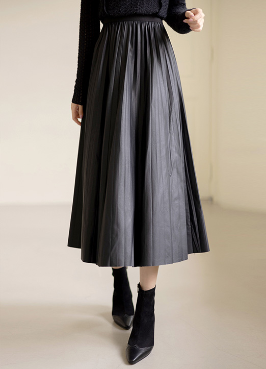 [ 在隐隐的光泽感的人造皮革材质上, 以细碎的百褶设计, 适合日常享受的长款百褶裙.]