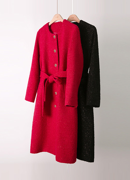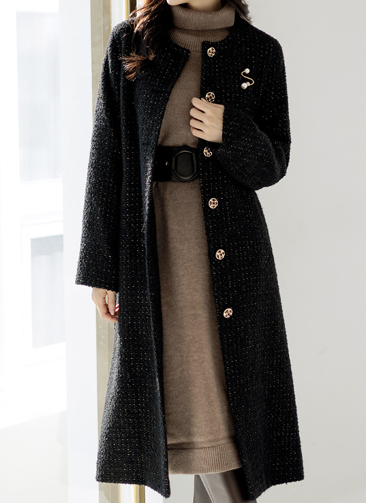 [混合了金色珠光,能感觉到高档的粗花呢长款大衣:) 羊毛混纺的圈圈纱粗花呢材质,密度高,用粗大的珠宝纽扣打造出女人味。]