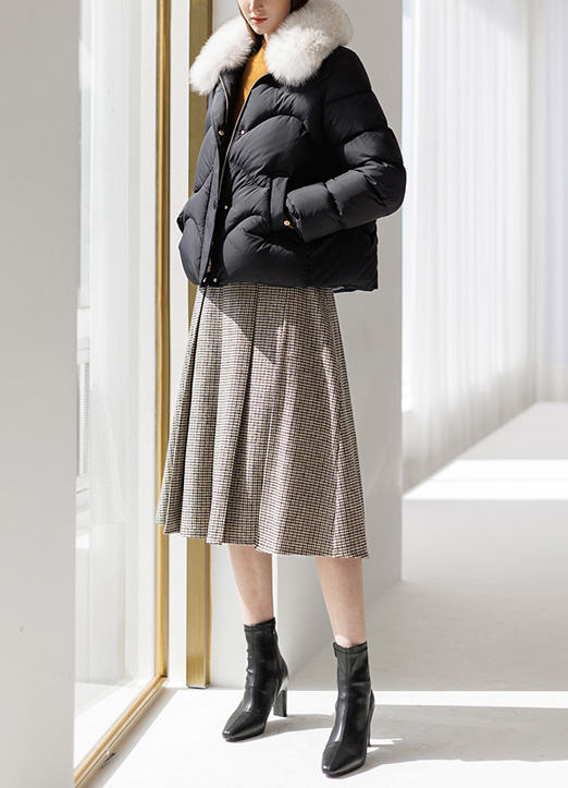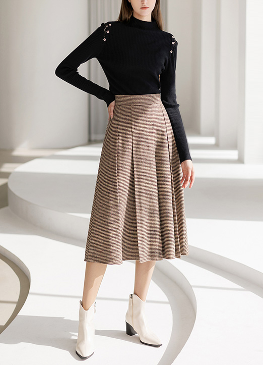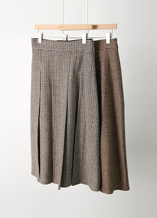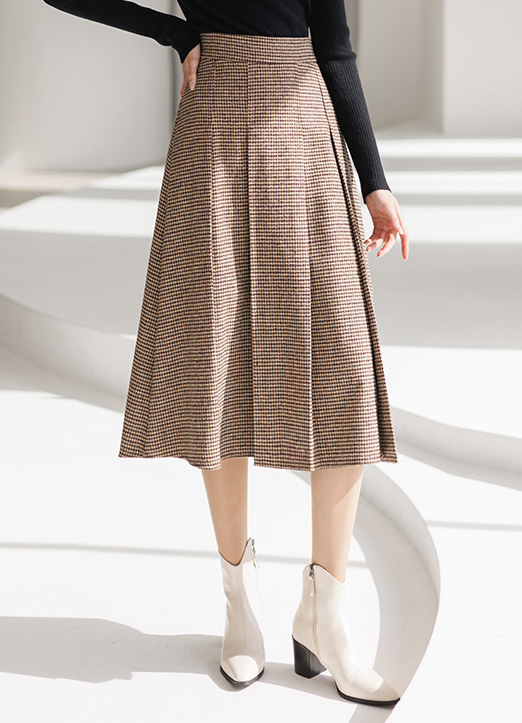 [Theonme] 羊毛混纺犬牙格纹褶裥中长裙
