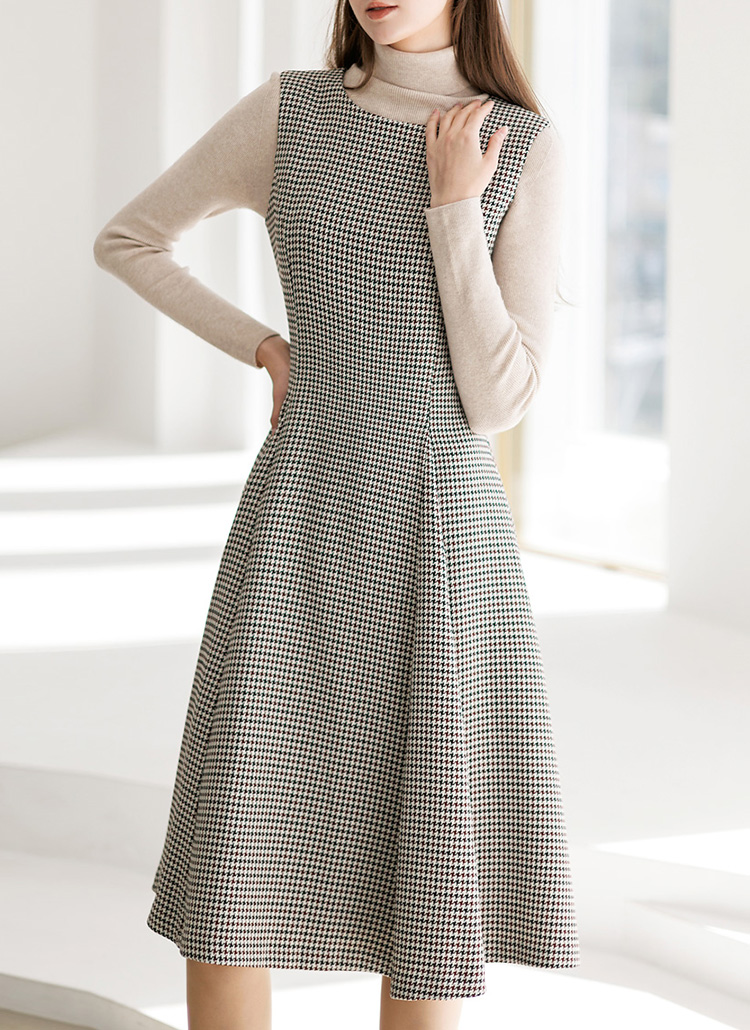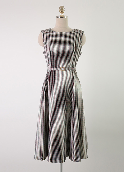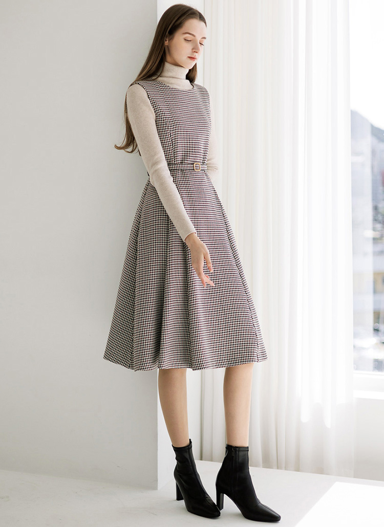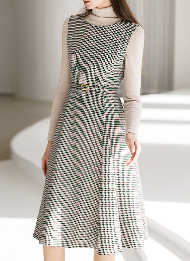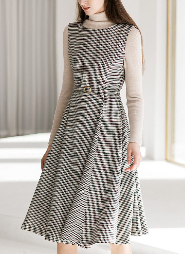 [Theonme] 犬牙格纹腰带SET吊带A线条连衣裙