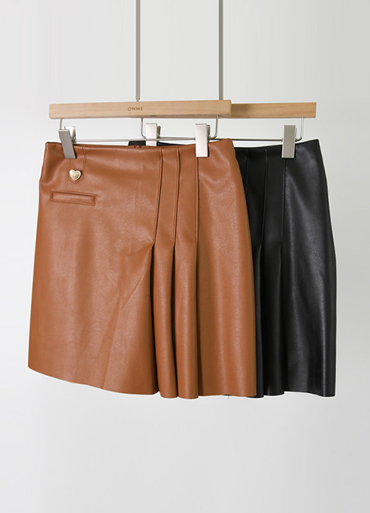 [用心形纽扣增添可爱亮点的侧边百褶的皮革裙:) 迷你衣长的皮革材质,突显女性化的亮点,毫无负担地能感受到时尚感。]