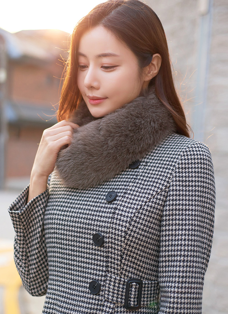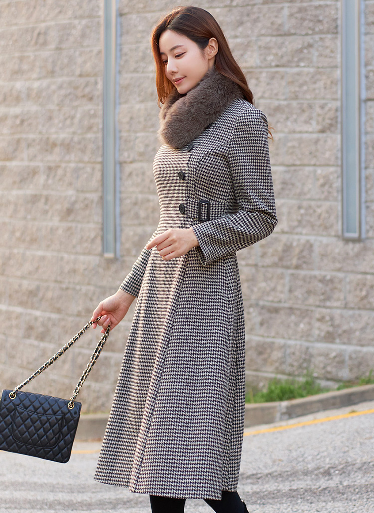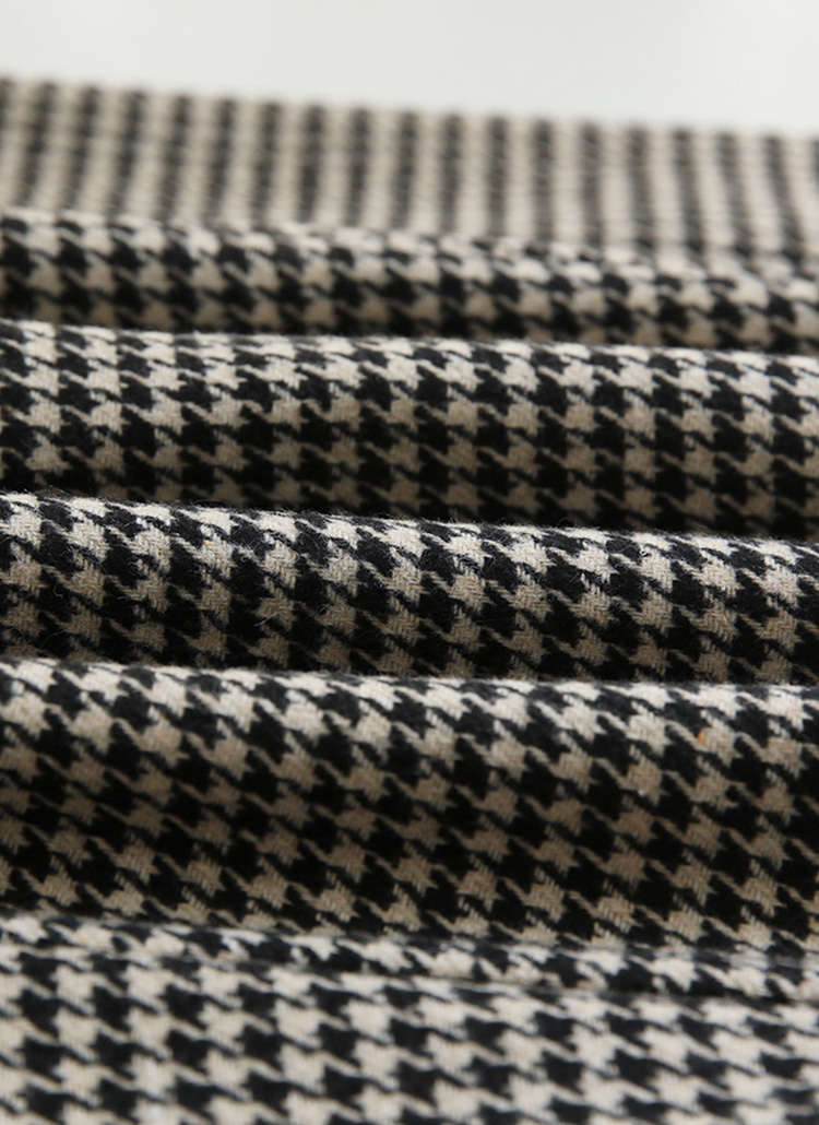 [燕子格子图案能感受到保暖的情调,盖住膝盖的衣长和丰盛的喇叭线条,方形领口增添了女人味儿,适合正式装扮时穿着。]