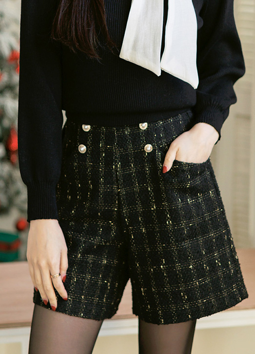 유레브 더블 진주 쥬얼버튼 골드펄 트위드 숏팬츠