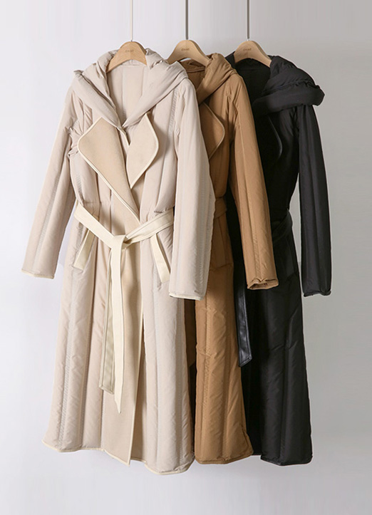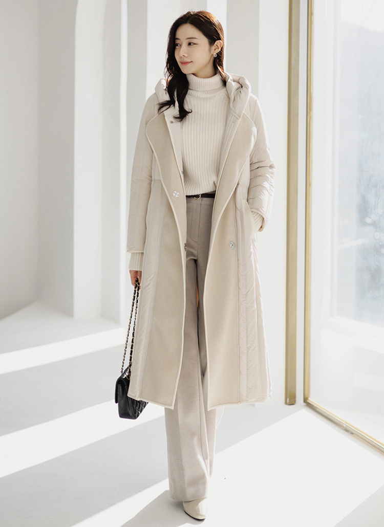 아델라 울50 모직 배색 덕다운 패딩 롱 코트