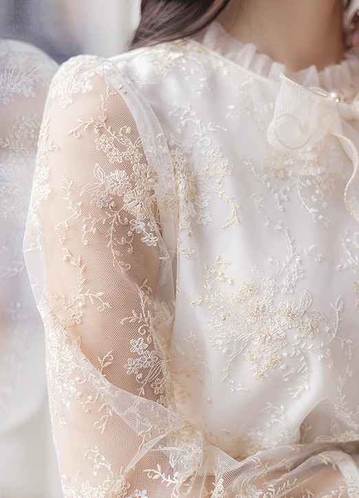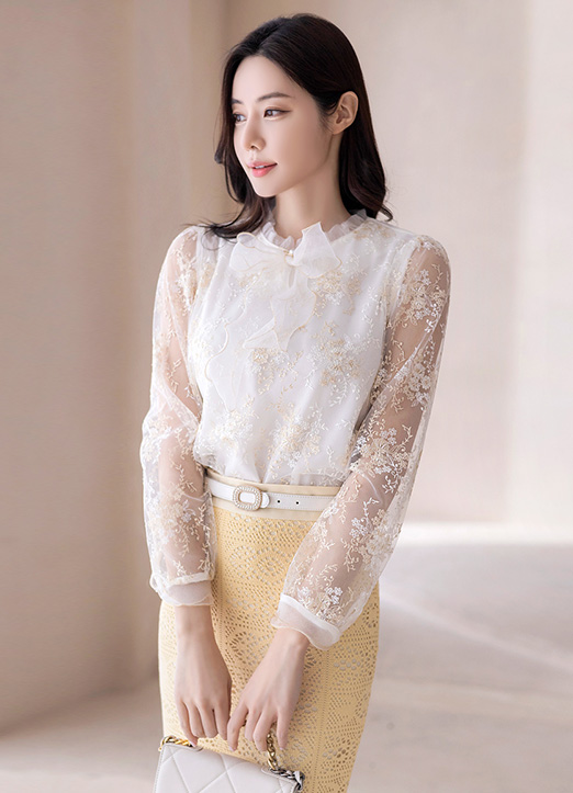 세즈온 노방 리본 플라워 자수 시스루 블라우스