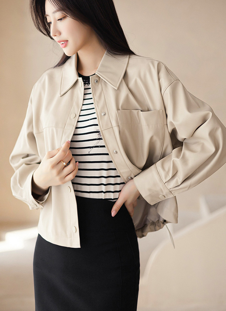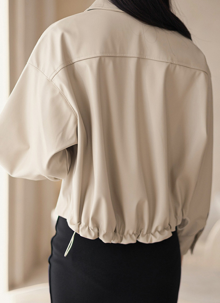 스트링으로 핏 조절이 가능한 레더 자켓이에요 :)