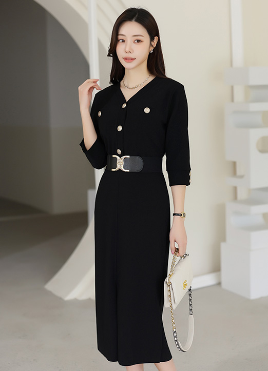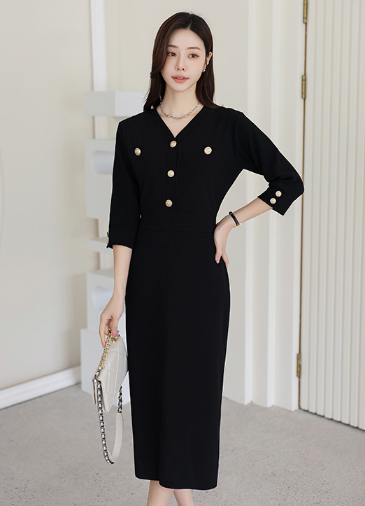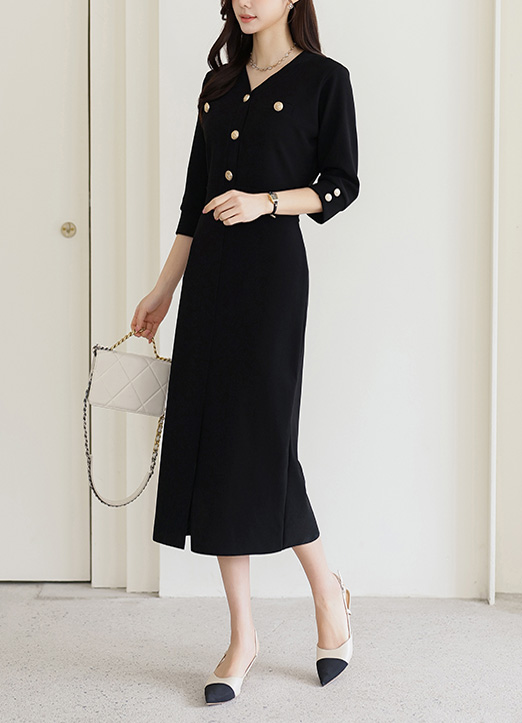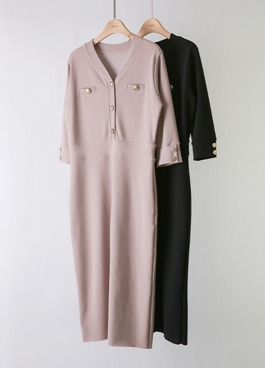 [Theonme] 골드버튼 포인트 7부소매 텐션 원피스_2color