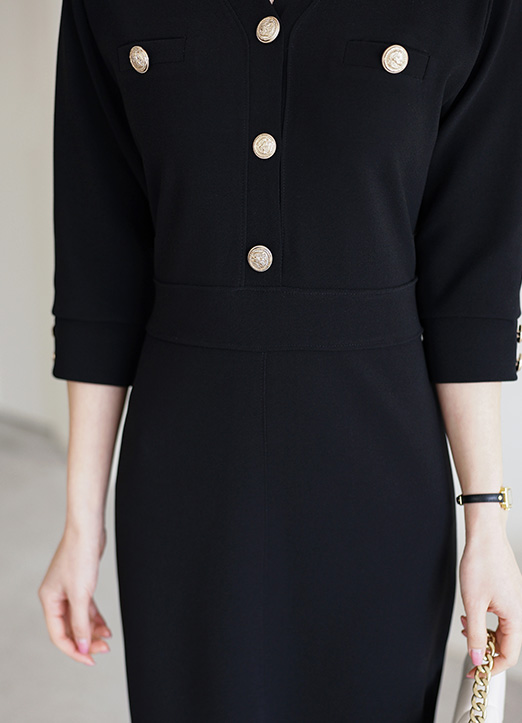 [Theonme] 골드버튼 포인트 7부소매 텐션 원피스_2color
